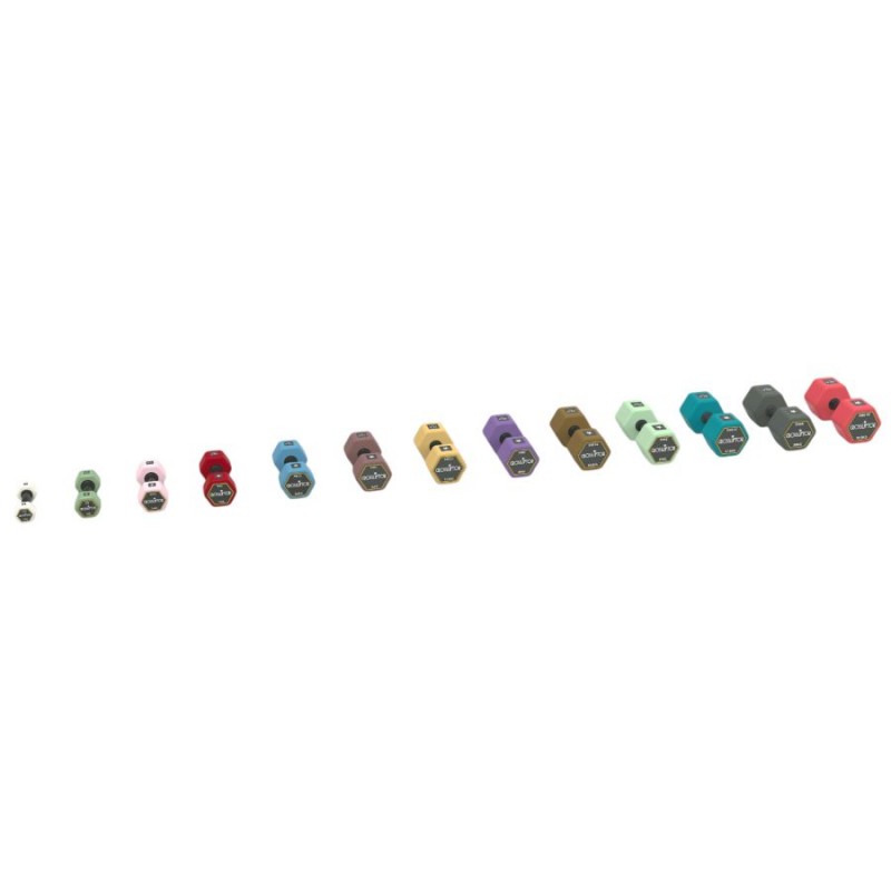 Whatever the weight of the dumbbell, the handle remains the same length for ease of grip. Only the heads at the ends change size according to weight, while remaining more compact than conventional hexagonal dumbbells thanks to their unique design.