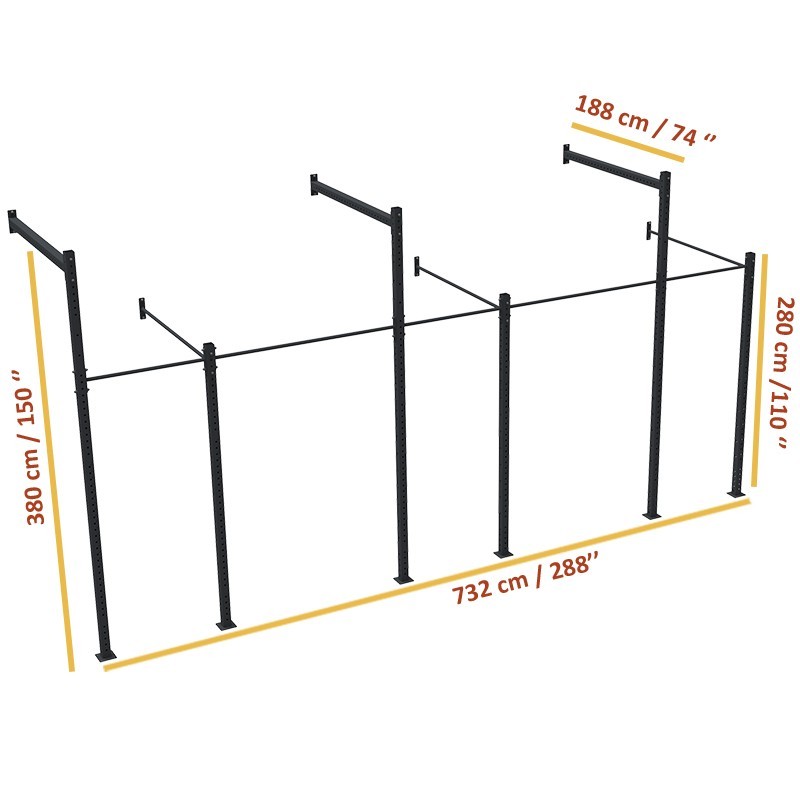 Steel rig made in CrossLiftor factories and configured for rope climb and/ or ring muscle-up exercices. There is a large size rig up to 20 people work. The sturdy 80x80mm steel gauges will ensure great stability.
