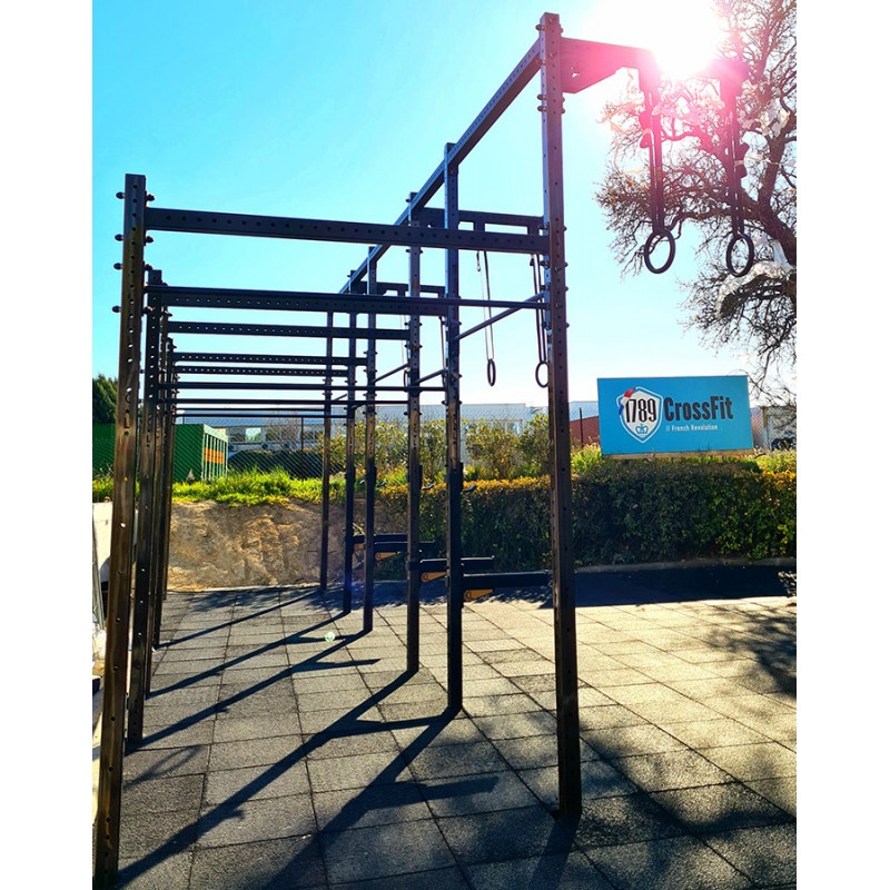 Cage Murale Muscle Up Rust en acier fabriquée dans les usines CrossLiftor, conçue pour l'extérieur et configurée pour les exercices de montée de corde et/ou ring muscle up. Les poteaux robustes en acier de 80 x 80 mm assureront une stabilité incroyable. La finition "Rust" des pieds en métal brut/rouillé puis vernis garantit une résistance aux intempéries et un look hors du commun. Ce traitement spécifique a été conçu pour allier l'esthétique à la résistance à l'érosion. Les barres de traction restent de couleur noire sablée pour ne pas altérer le grip.