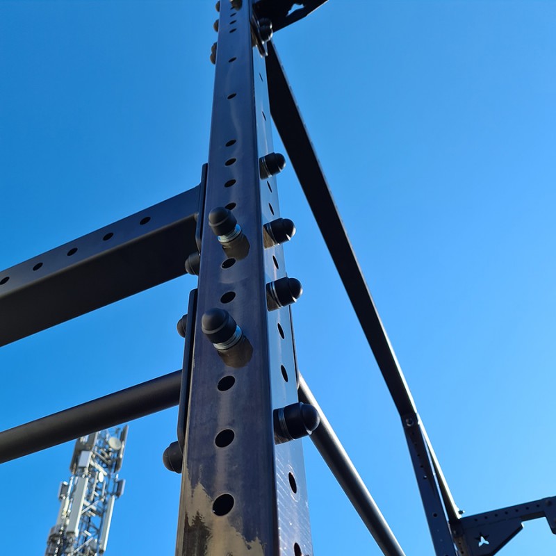 Les poteaux Rust de cette cage Murale Muscle Up sont percés du même diamètre sur toute la hauteur afin de positionner ces accessoires en fonction de vos besoins. Chaque trou est numéroté pour faciliter leur placement.
