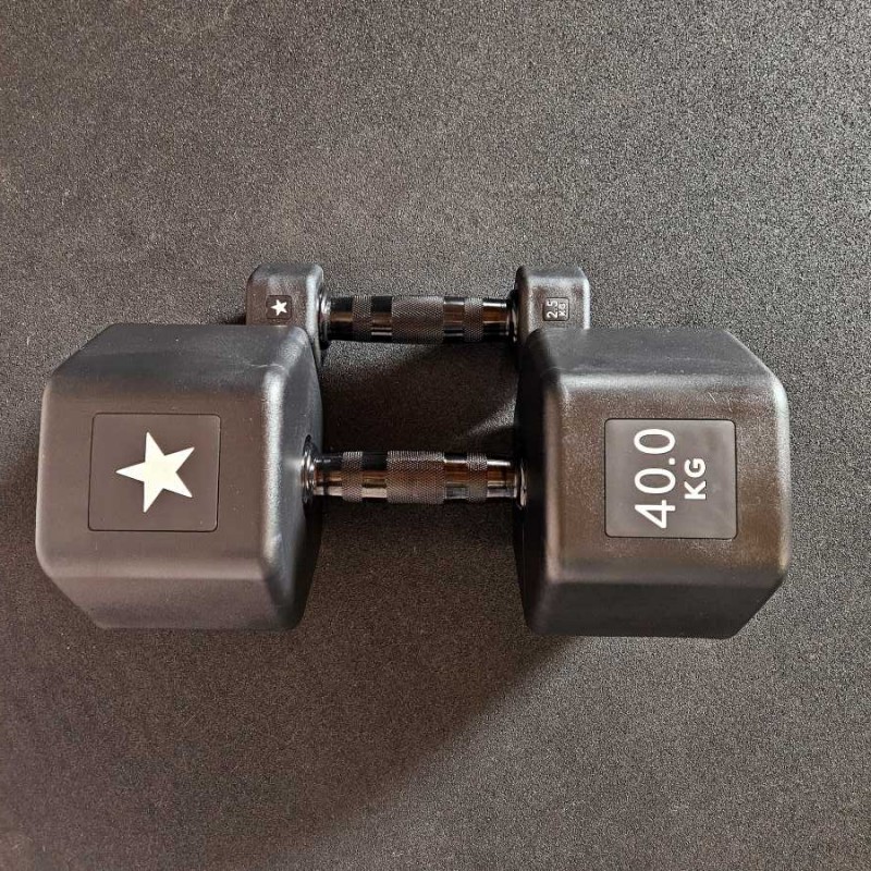 Quelque soit le poids de l'haltère, la poignée conserve la même longueur de poignée afin de faciliter la prise en main. Seules les têtes aux extrémités changent de taille en fonction du poids, tout en restant plus compactes que les haltères hexagonales classiques grâce à leur design unique.