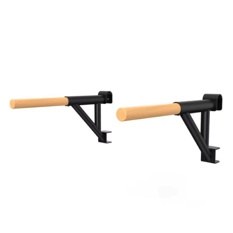 L’espalier Bois / Métal est accessoirisé : Barre de traction déportée, Barres à Dips, Kit élastiques/poignées.
